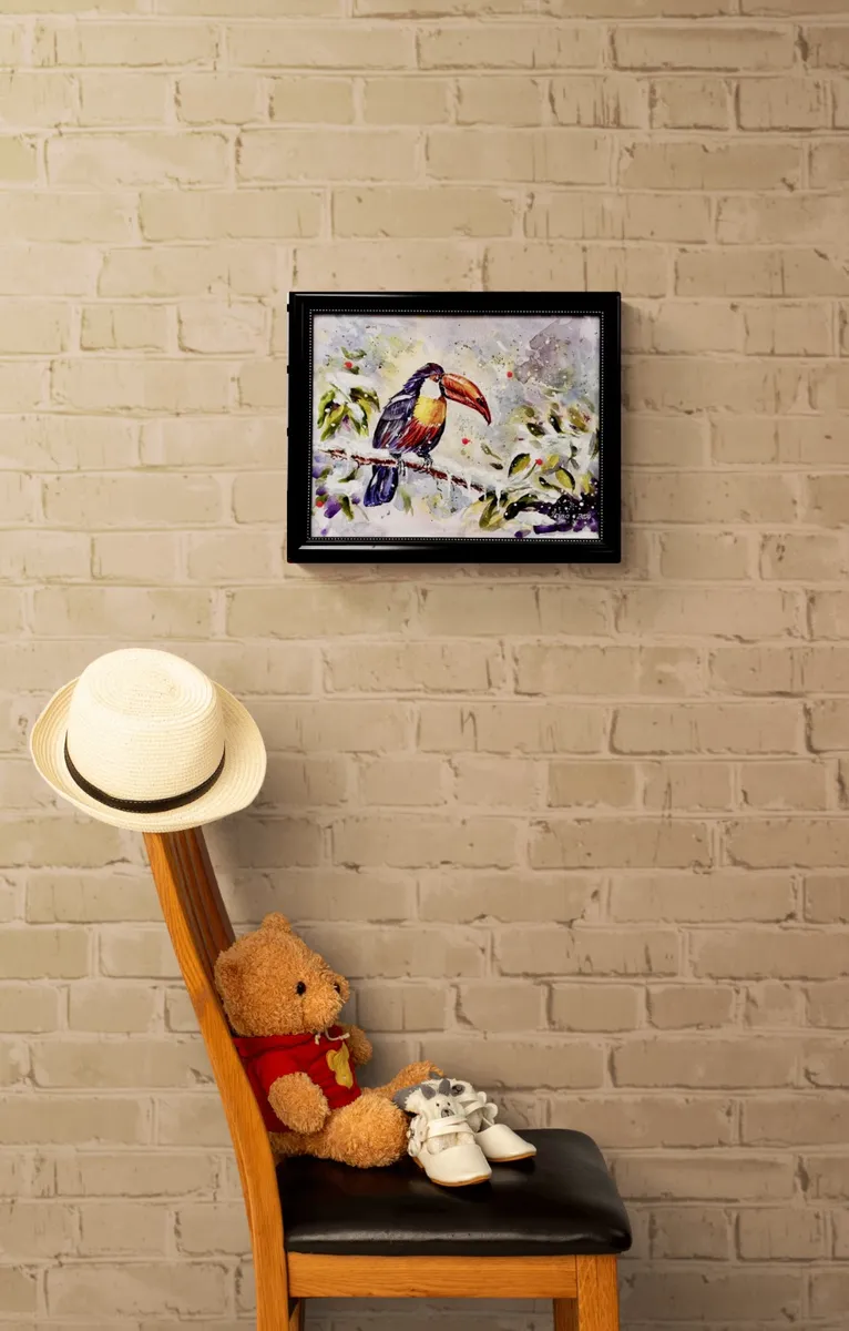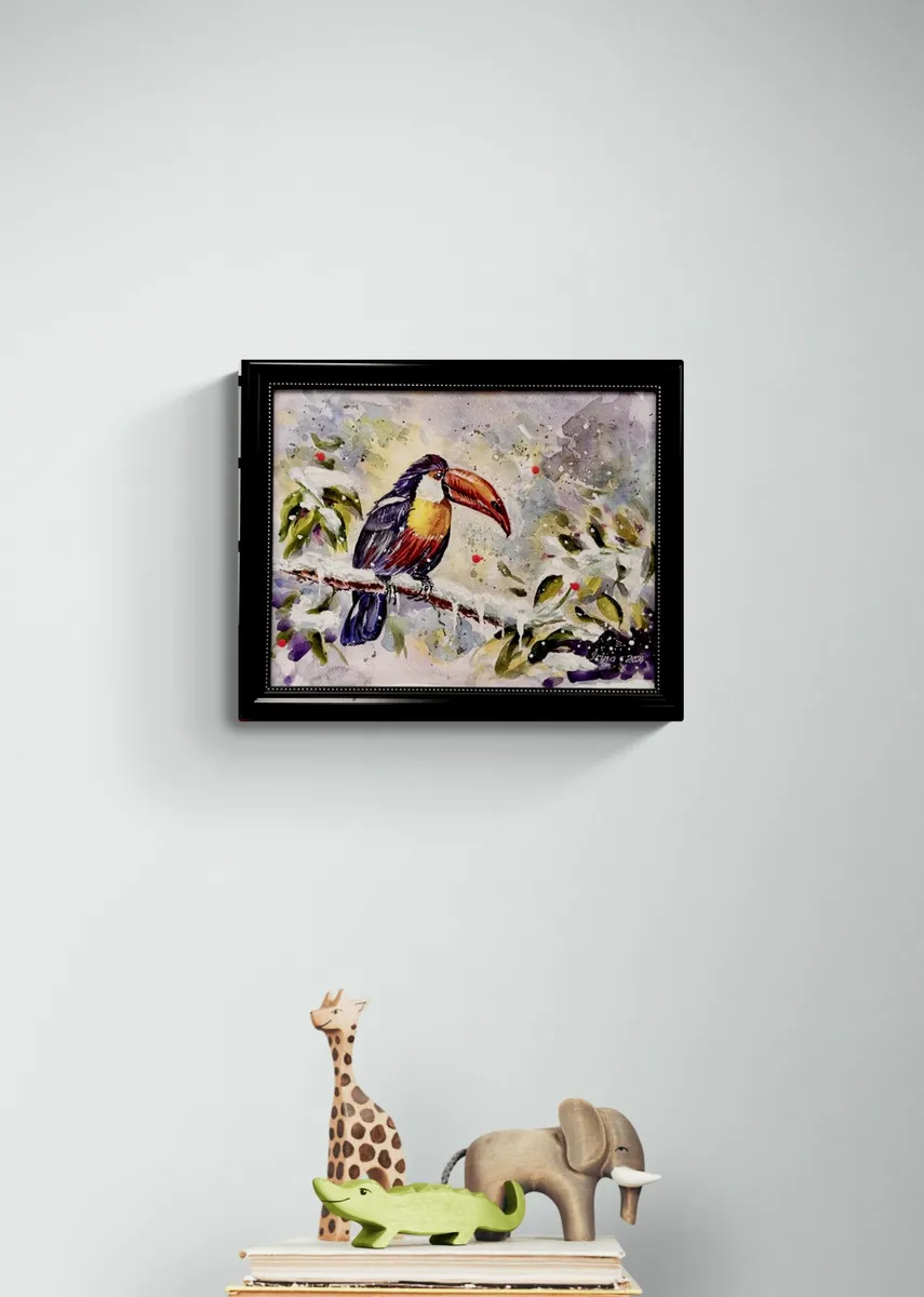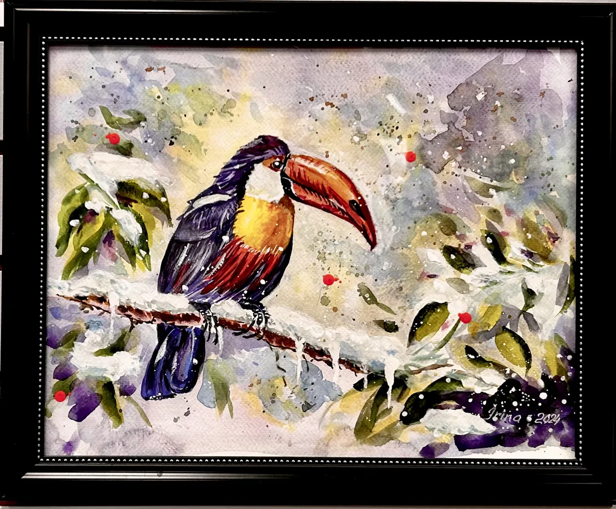 Bird Toucan is sitting on a snowed branch of a tropical tree. Fantasy. Collaboration with AI.