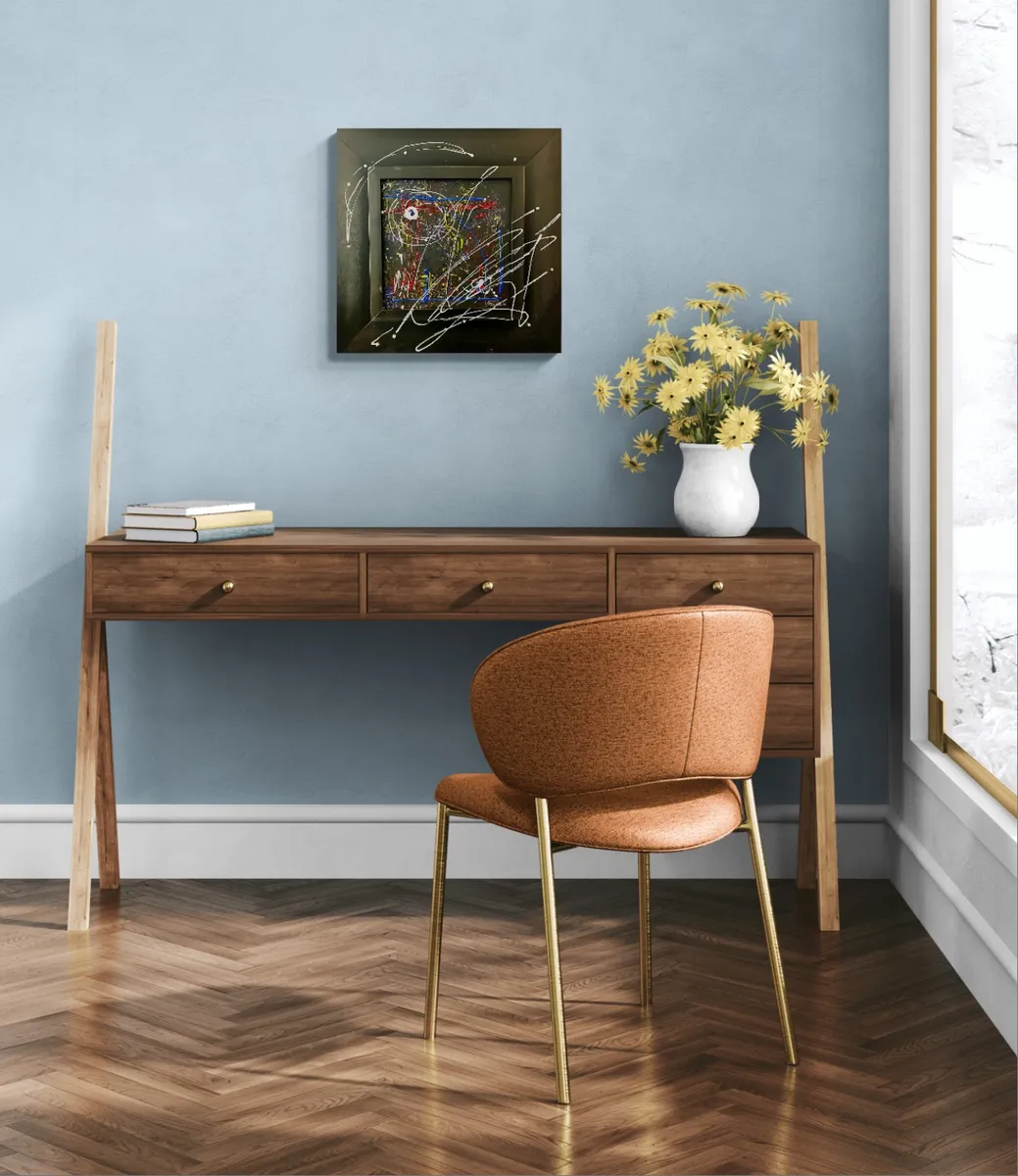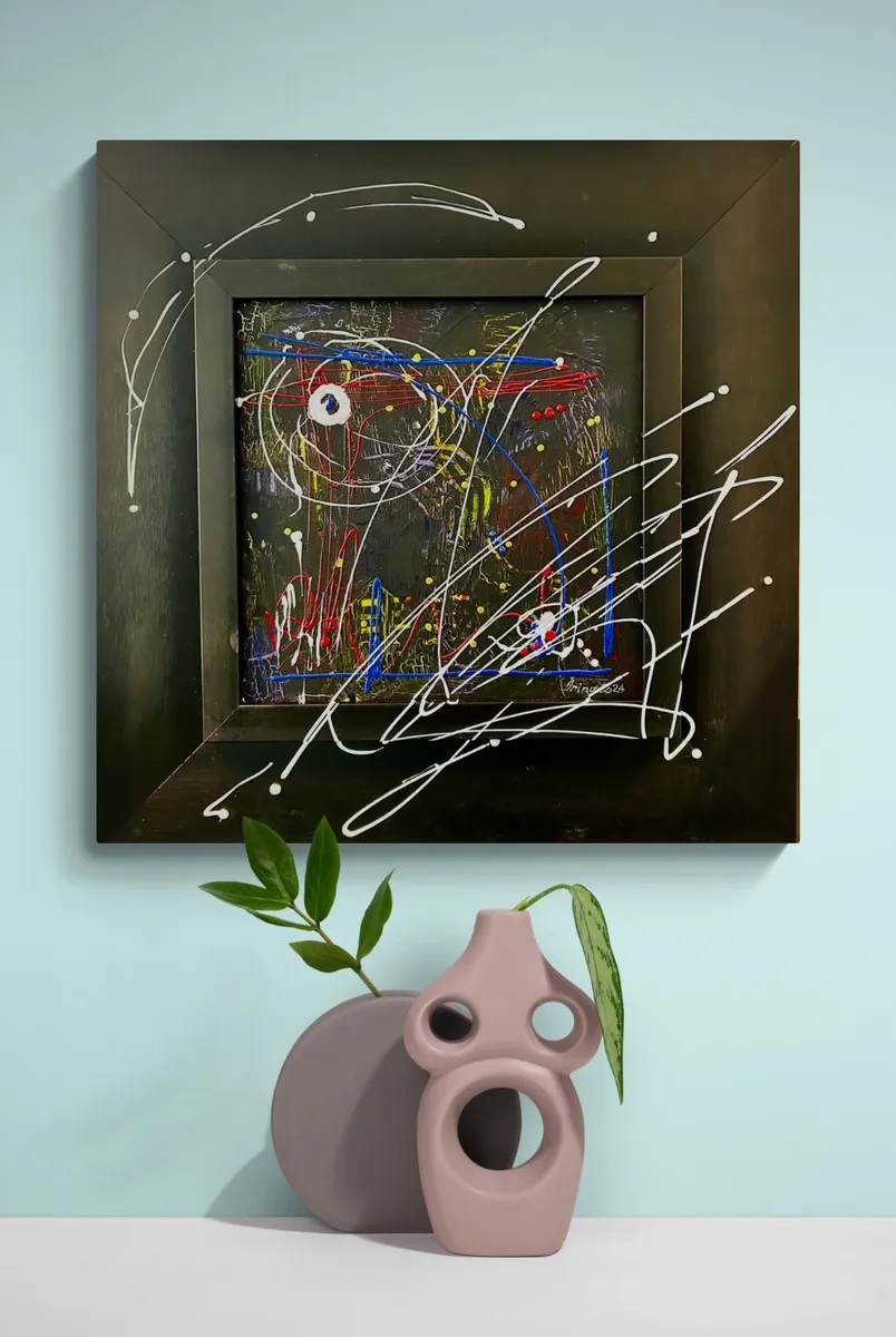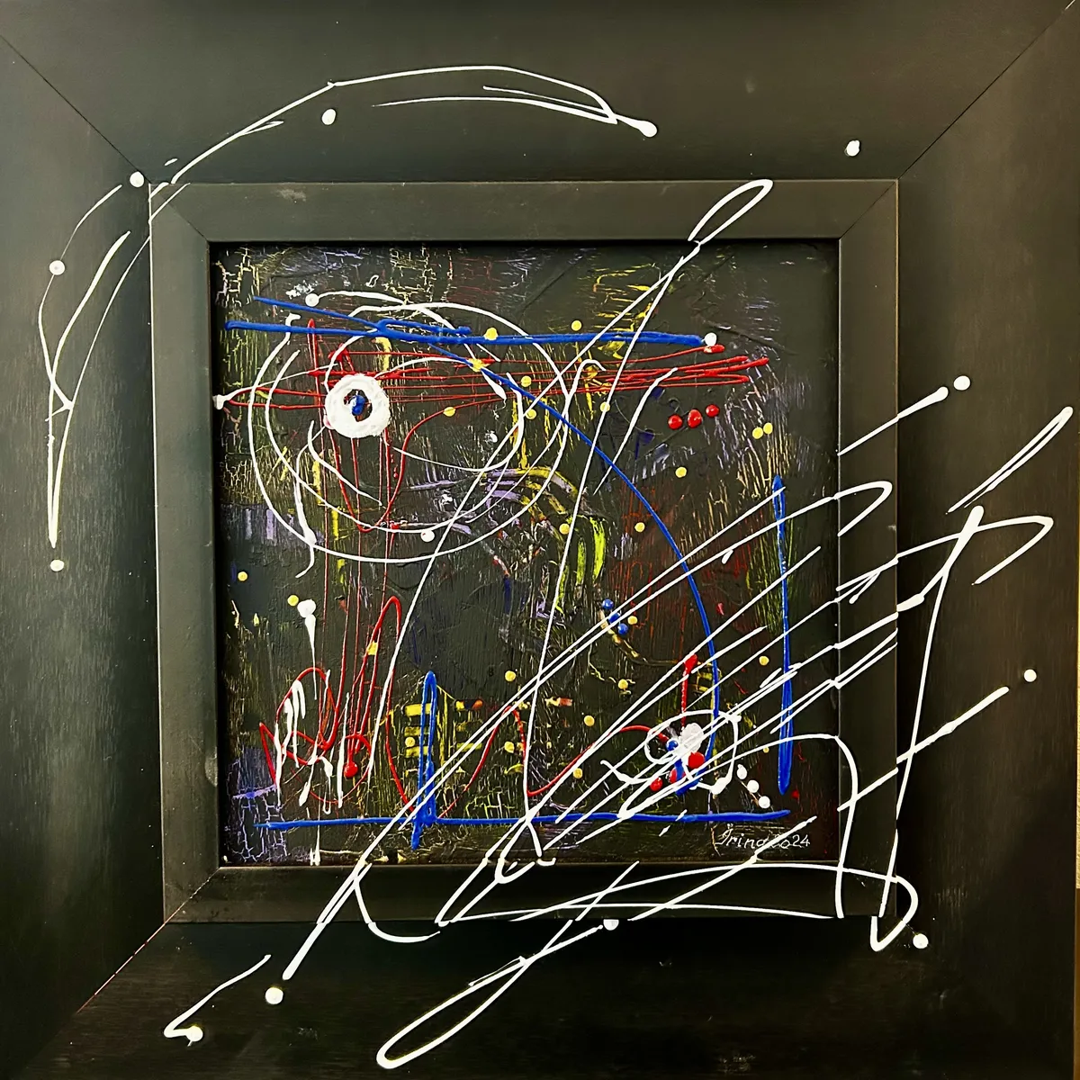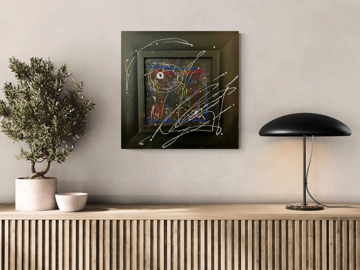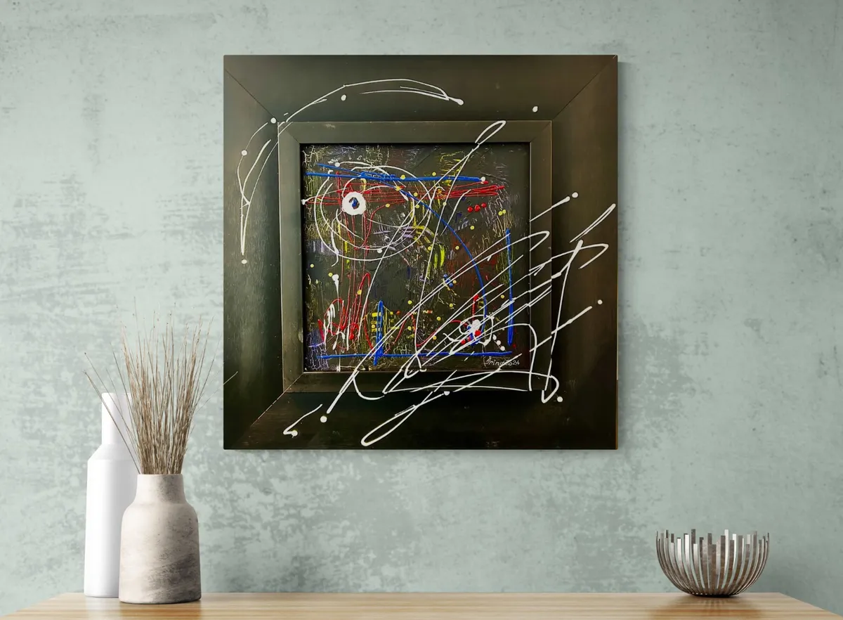 Abstract mixed media painting in an on a black square frame.
