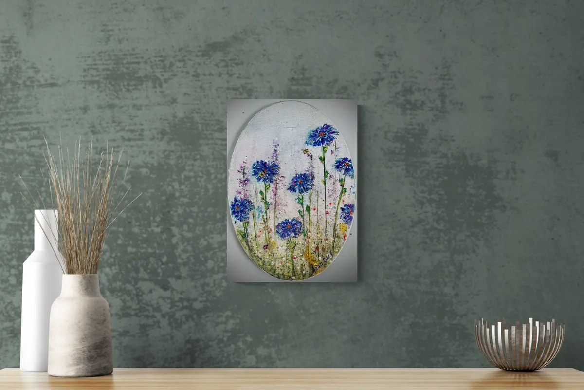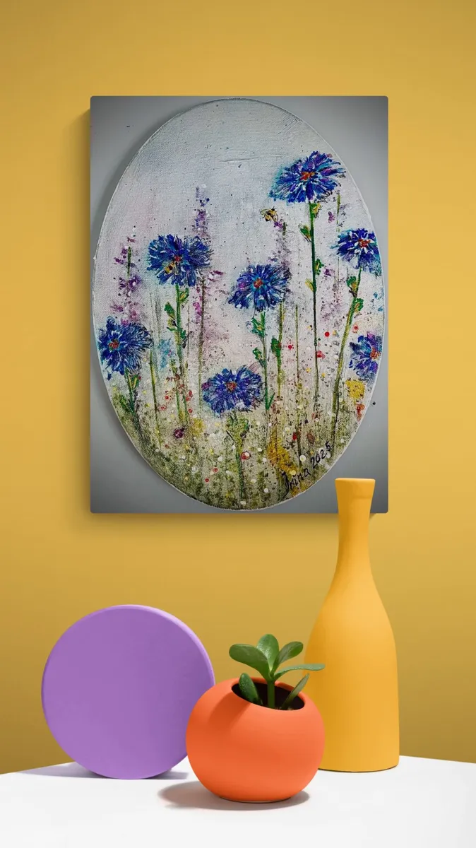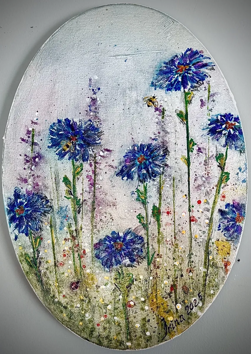 Cornflower-like flowers with the Bees and Ladybug. Oval canvas.