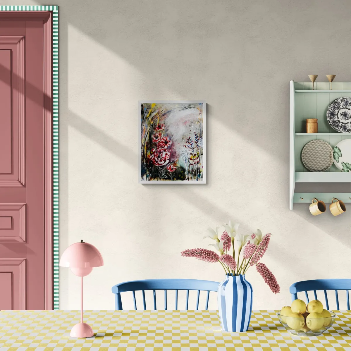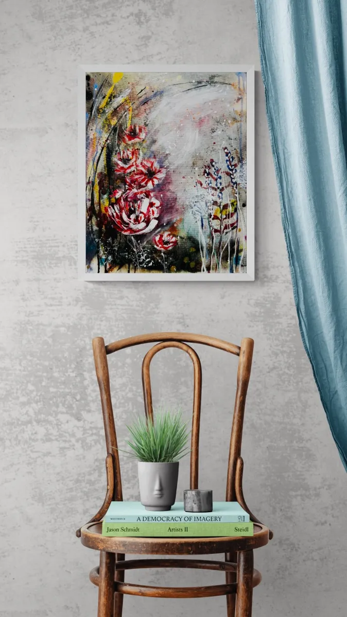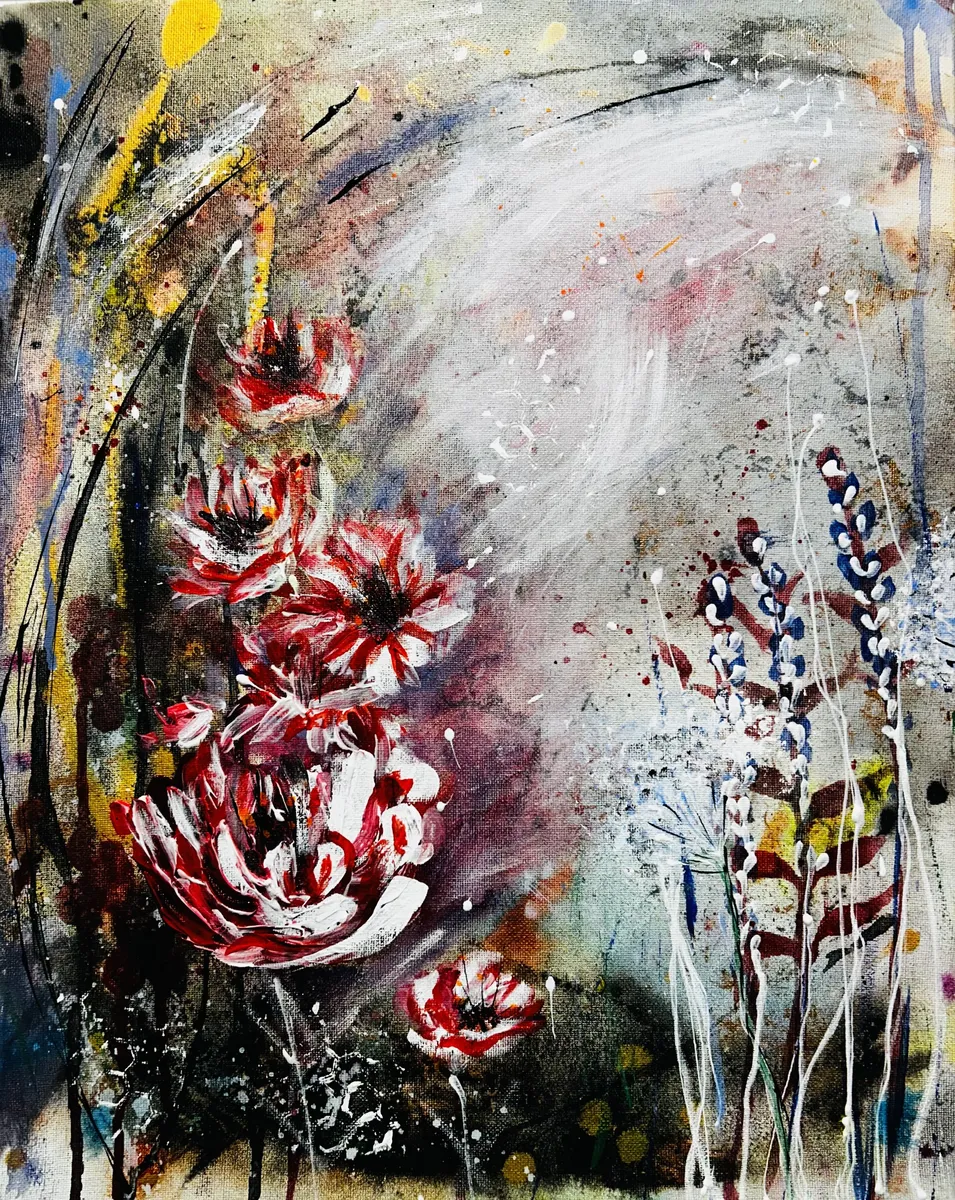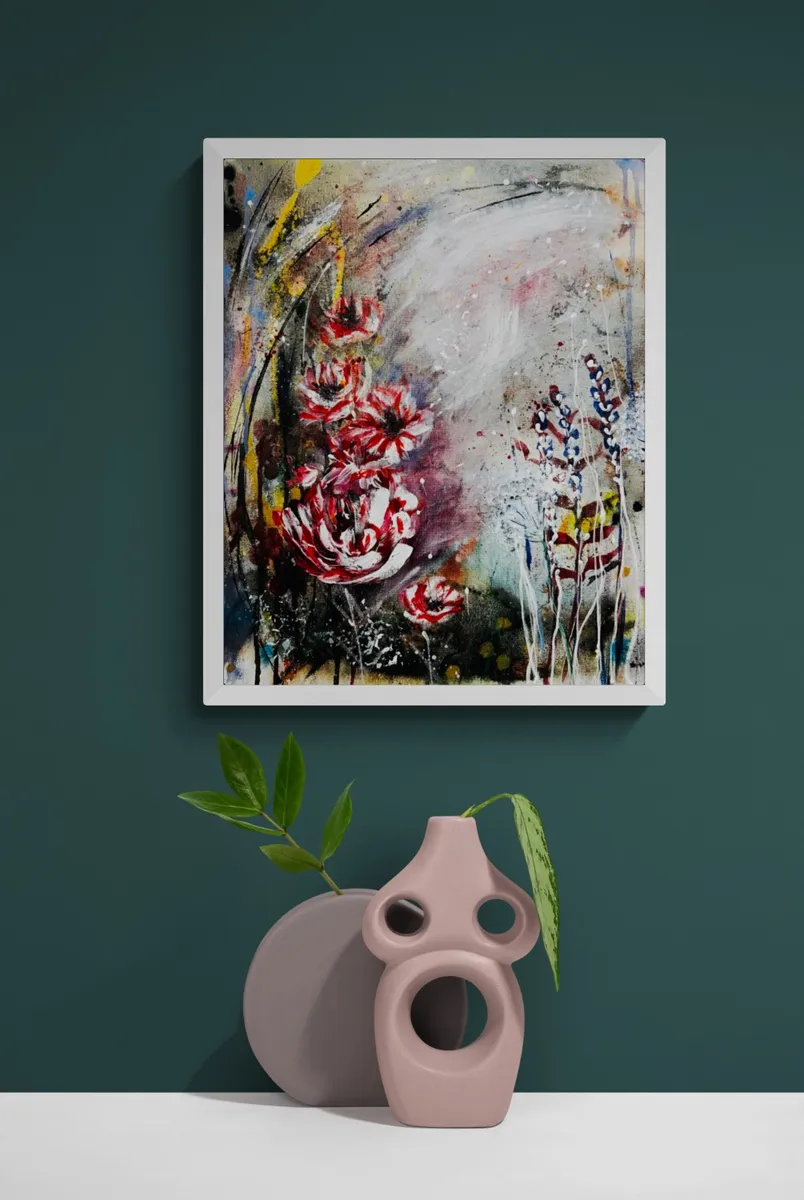 A fiery dance in crimson light, Petals swirling, burning bright. Chaos whispers through the air, Colours pulse—a wild glare. Dripping dreams and golden haze, Lost in nature’s fevered gaze. Electric vines and midnight glow, A garden where mad visions grow. White floating frame.