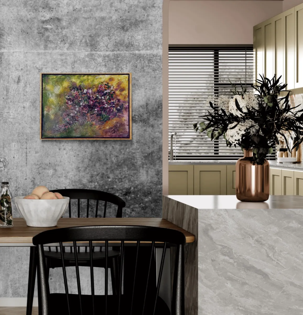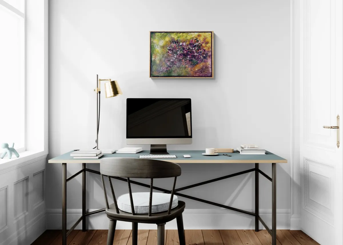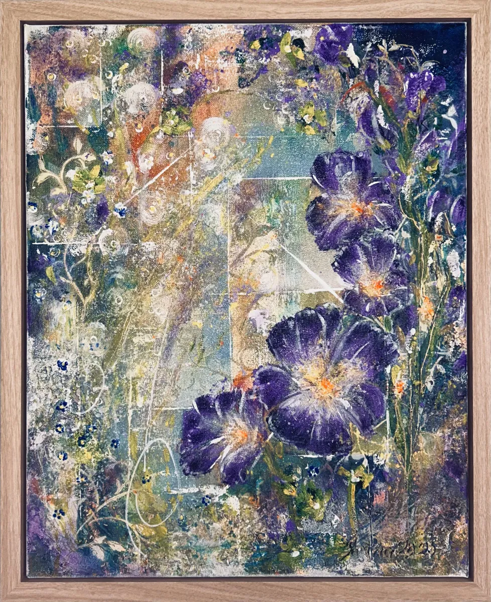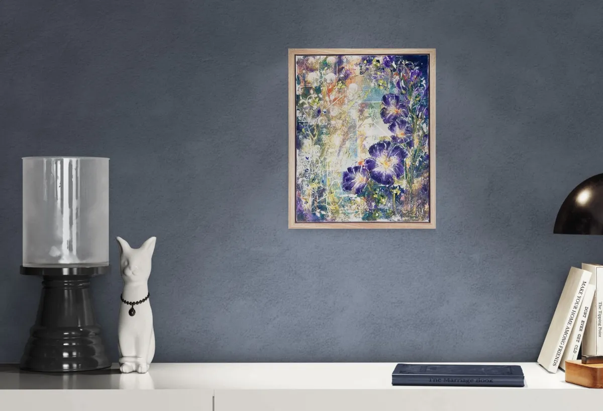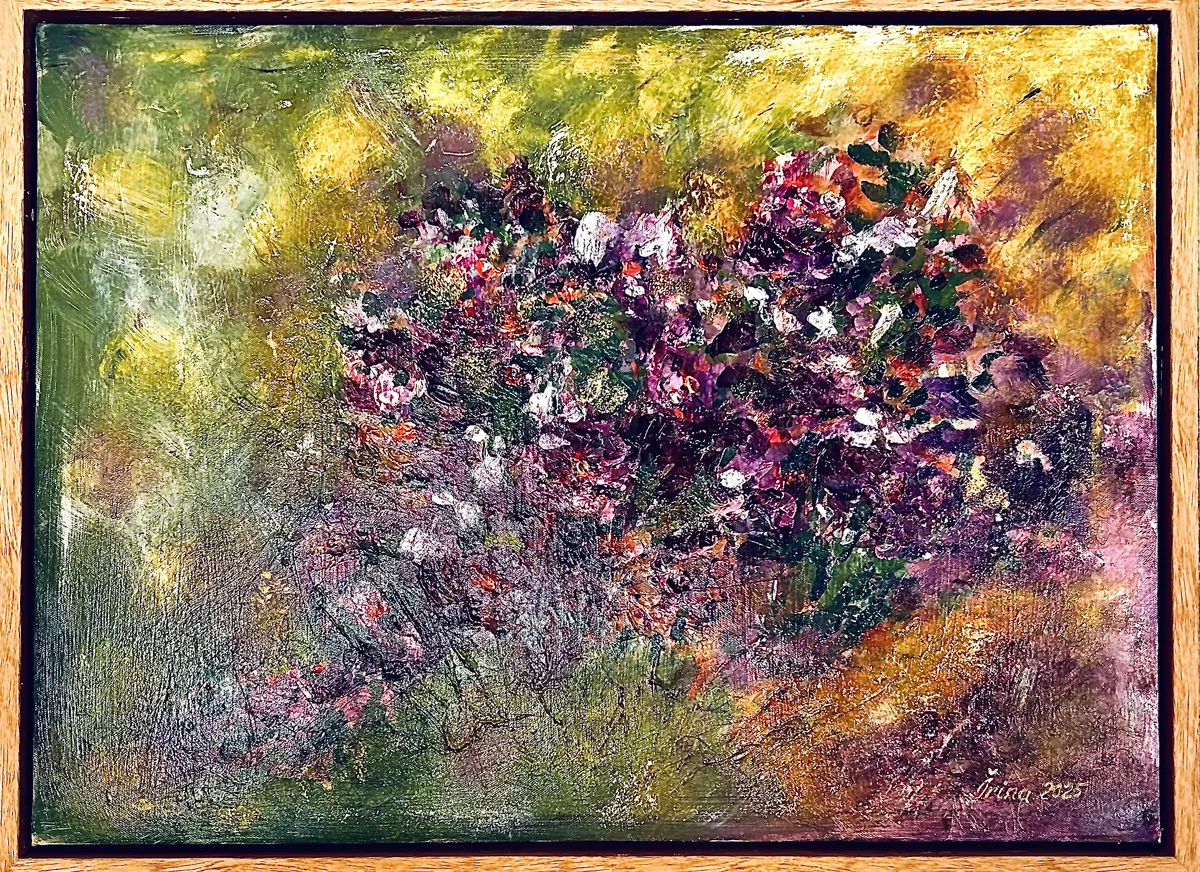 Impressionistic style purple and white flowers on a sunny side of garden. Framed.