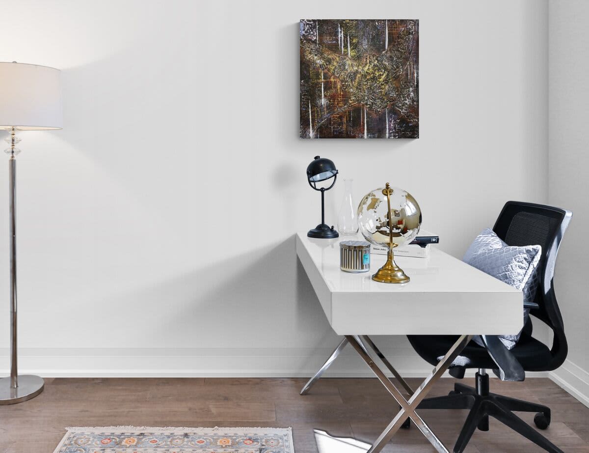 Traces of rockets launch in a dark sky. Textured Canvas with metallic paints and beads