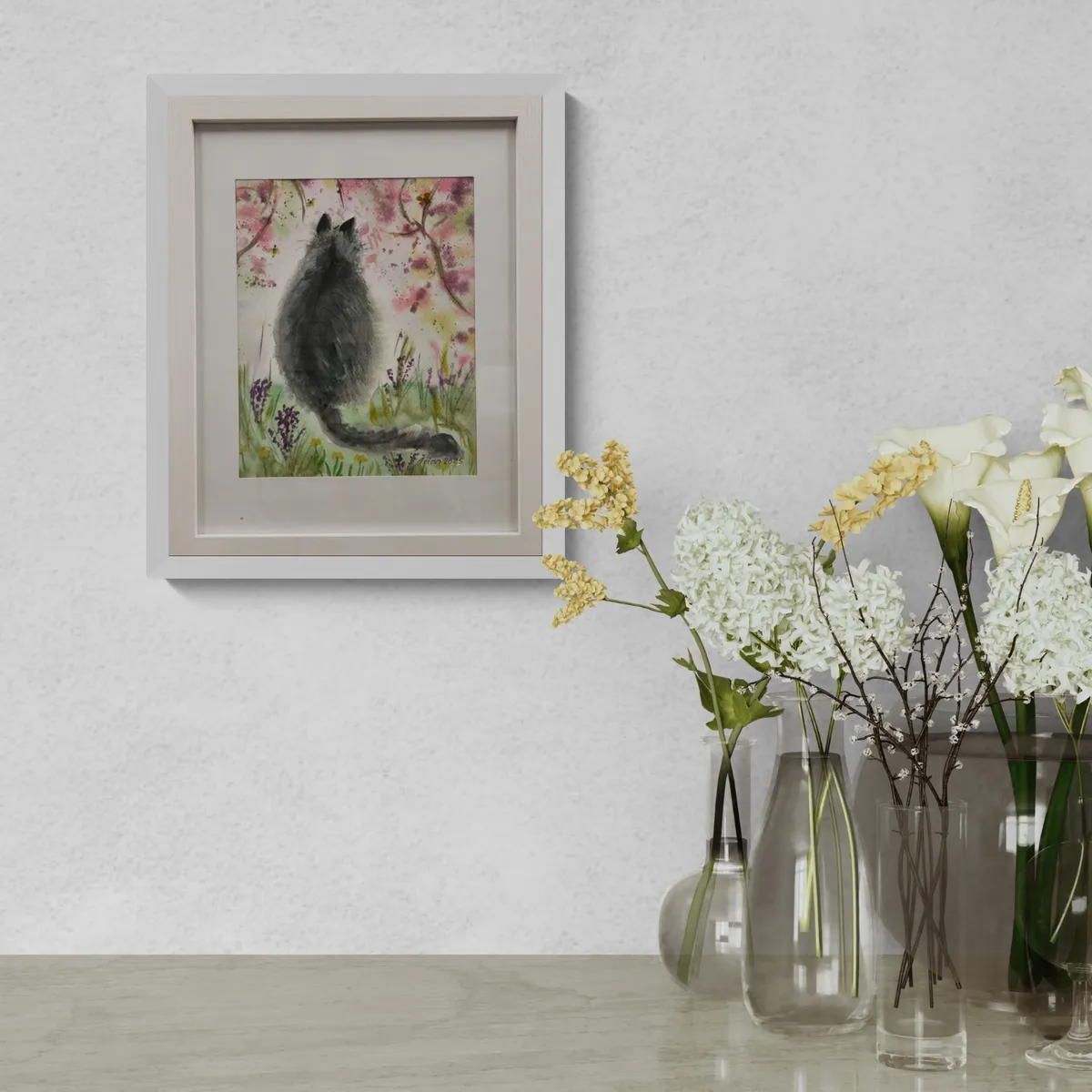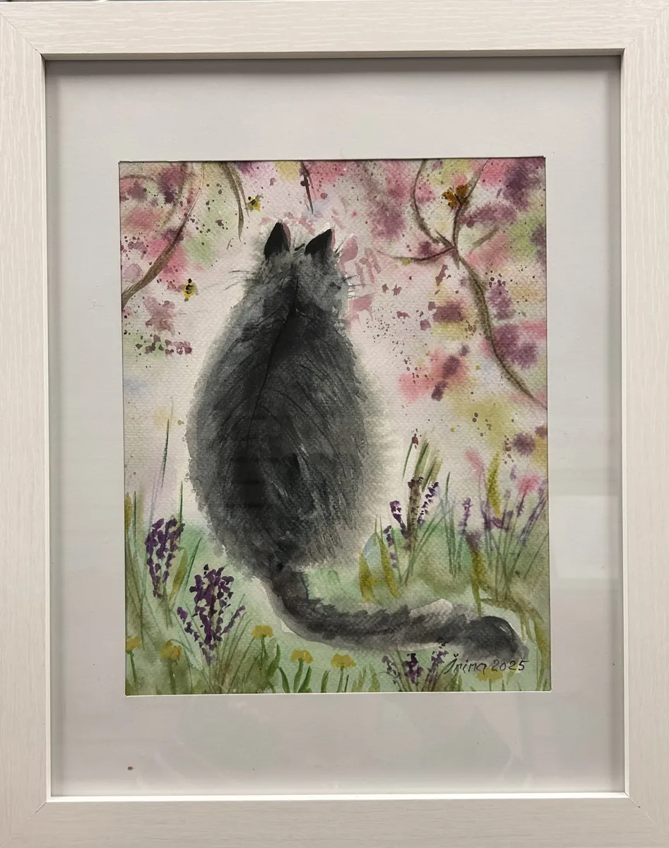 Fat Can sitting with back to us admiring a blooming garden and watching at the flying insects.