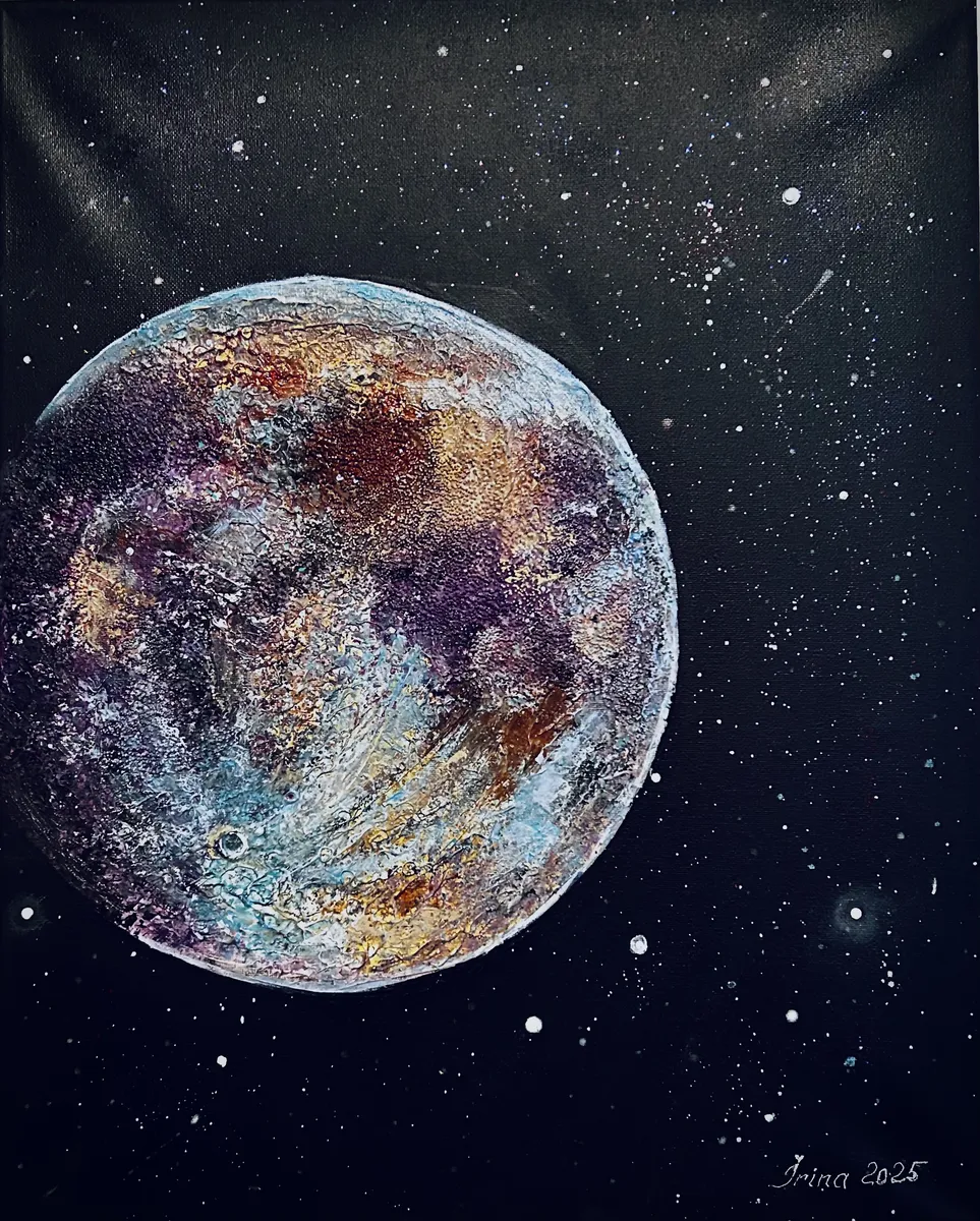 They said the moon was black and white, a silent stone in borrowed light— but science whispered, bold and true, it wears a robe of hidden hue. With strokes of texture, soft and bright, I chased its glow through day and night. Blues that bloom, and embered gold, secrets in its silence told. With paints that pulse when dark is near, the moon begins to reappear— not cold, not still, but full of fire, a quiet song, a deep desire. So let it glow, both fierce and far— our painted, glowing, spectral star. Not just a watcher in the skies, but a mirror to our dreaming eyes.