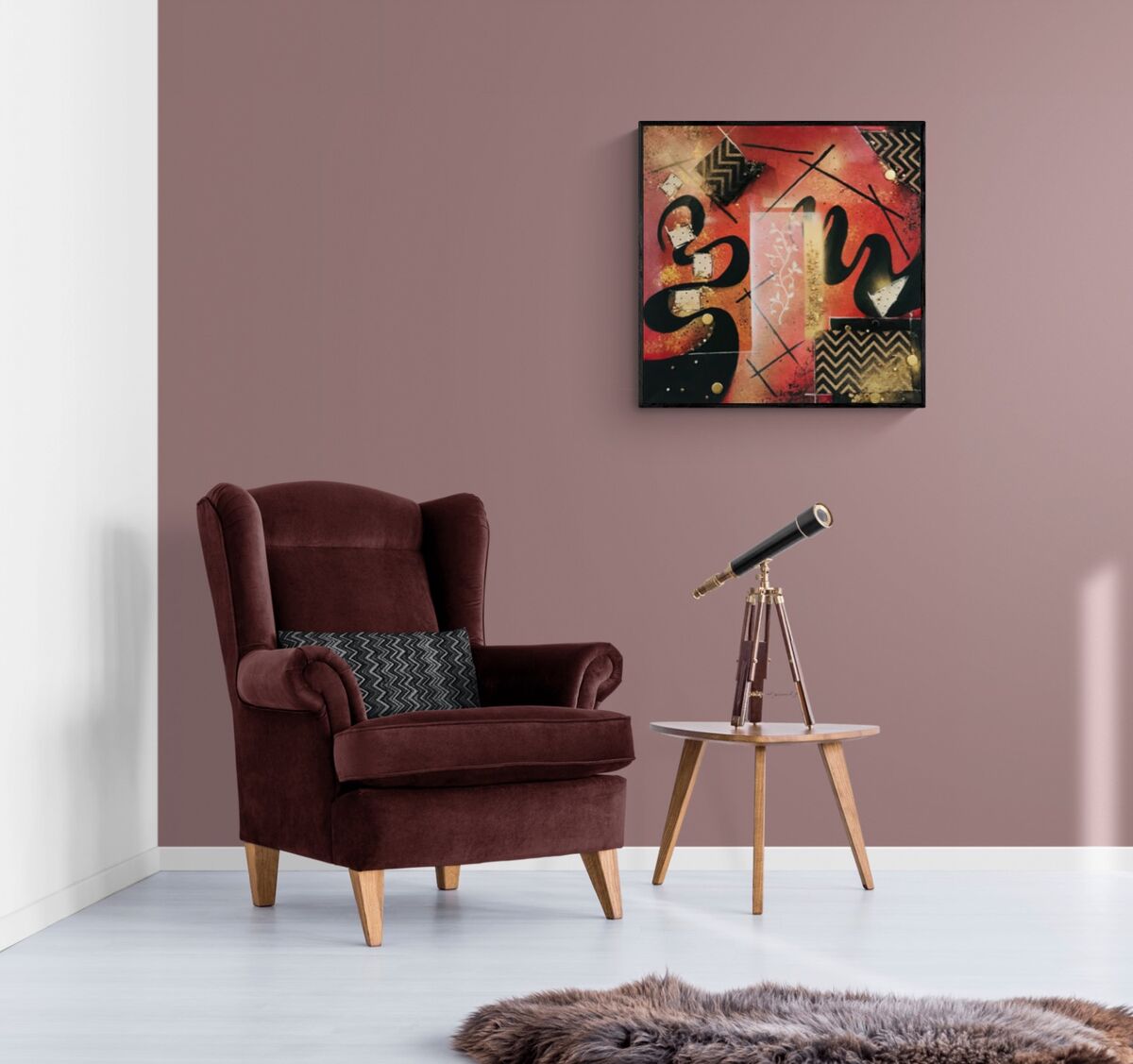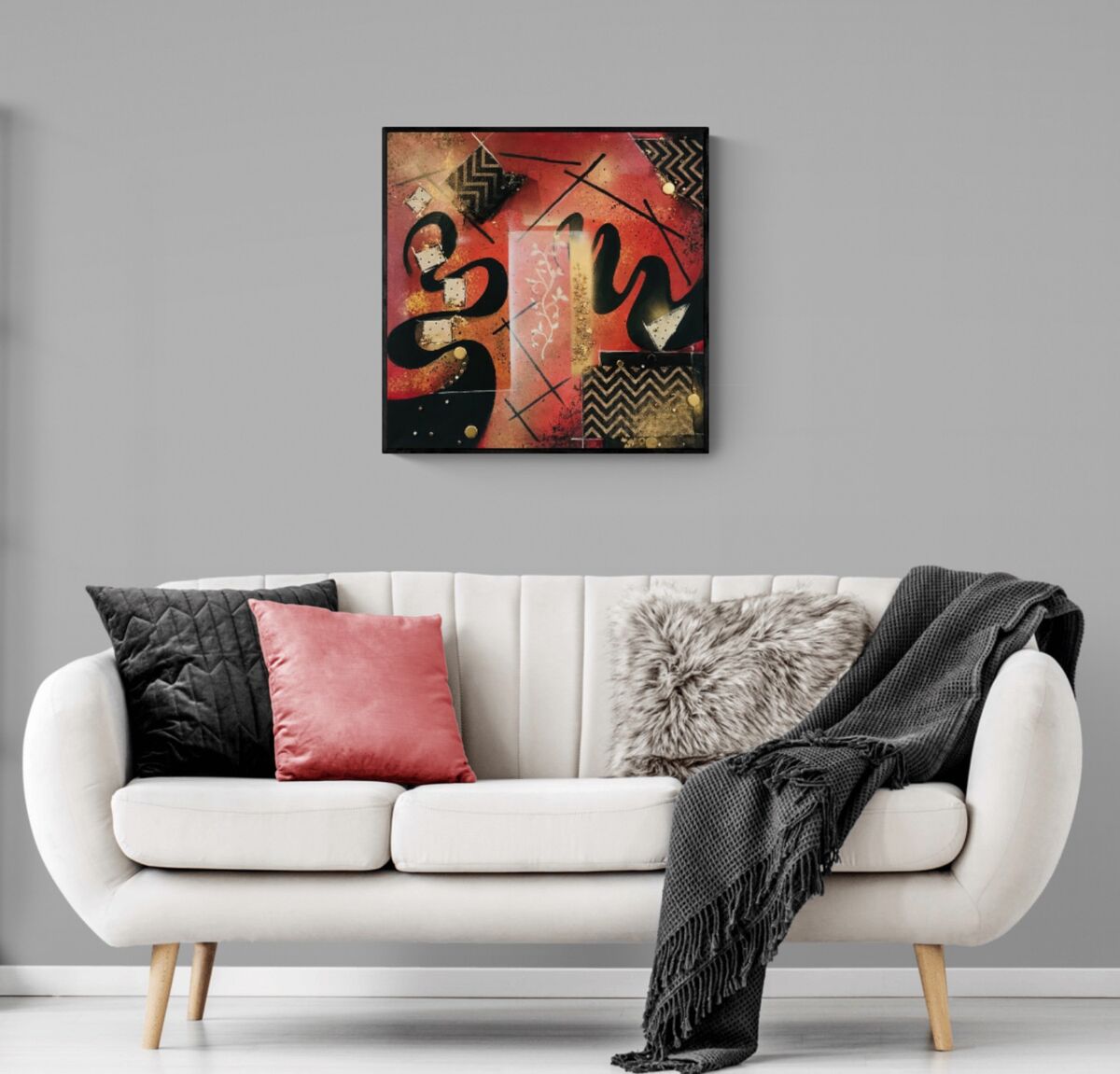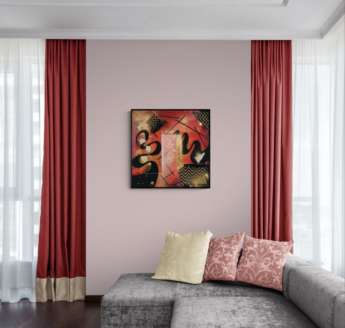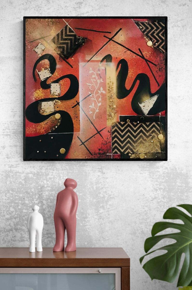 Mixed media abstract with red, black and golden paints would be a great focal point in a room.