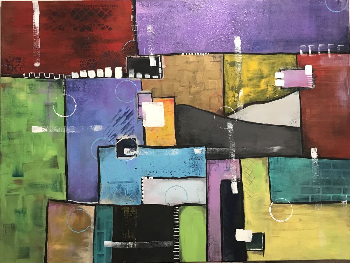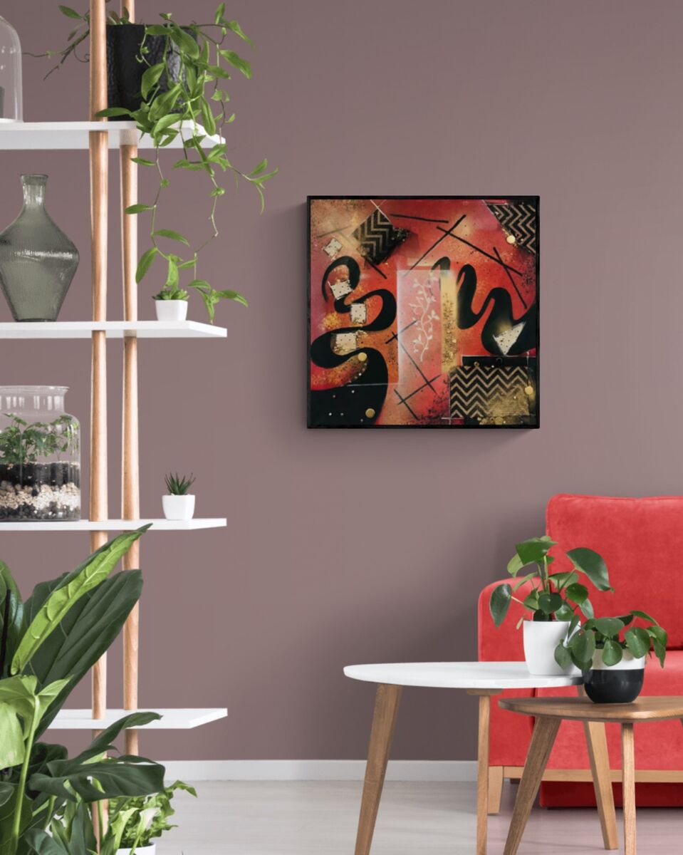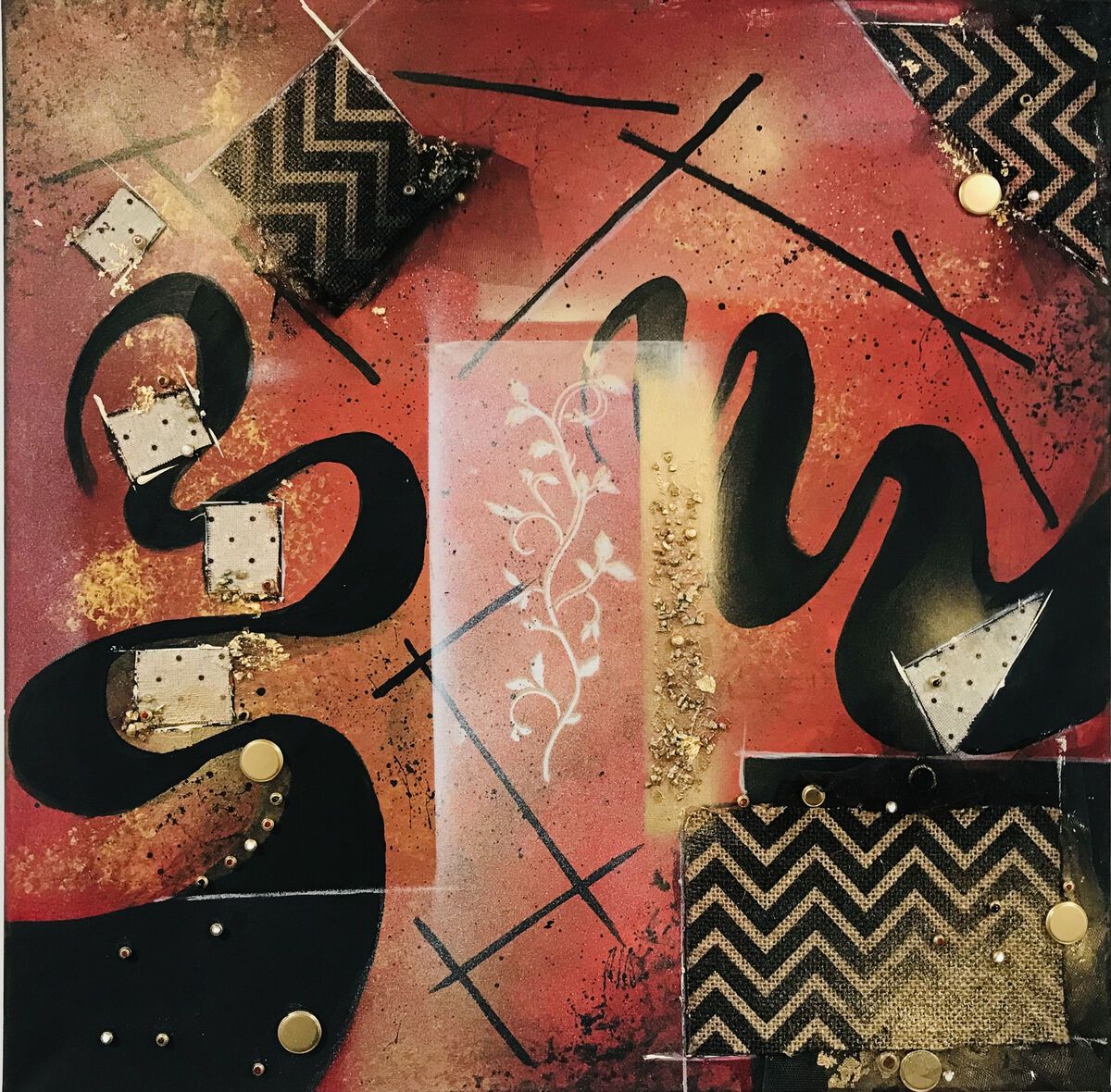 Mixed media abstract with red, black and golden paints would be a great focal point in a room.