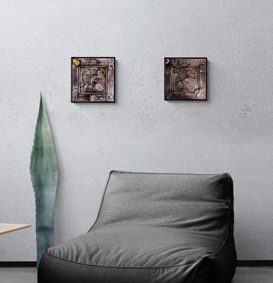 Diptych in a frame with metallic effect representing most important things in a world - Love and Home. They come together in our life.