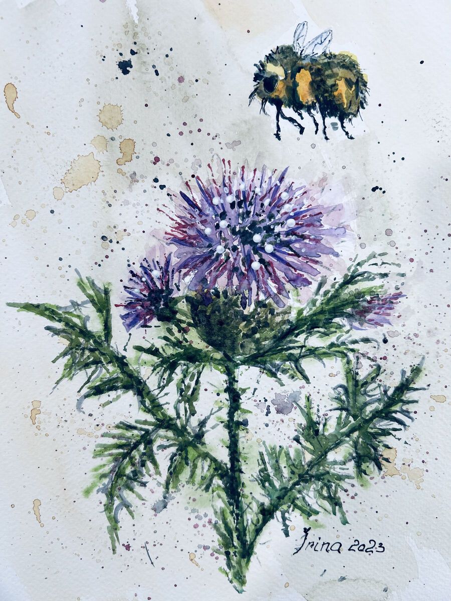 Small bumblebee is landing on a thistle flower. Simple beauty.