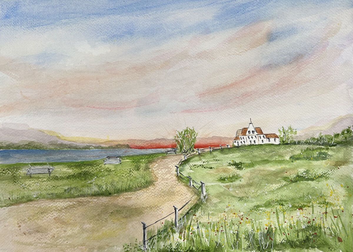 Simple watercolour landscape. Some human figures and birds are added to make the picture more "alive".