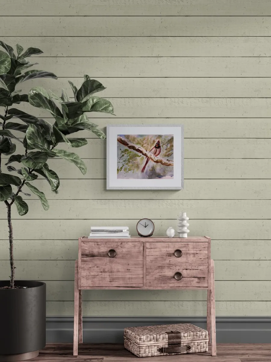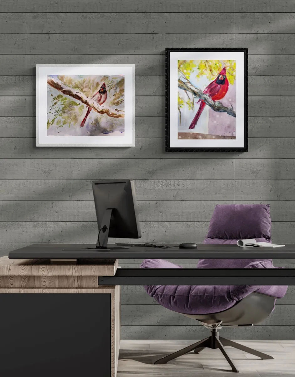 Female Cardinal on a snowed branch. White frame.
