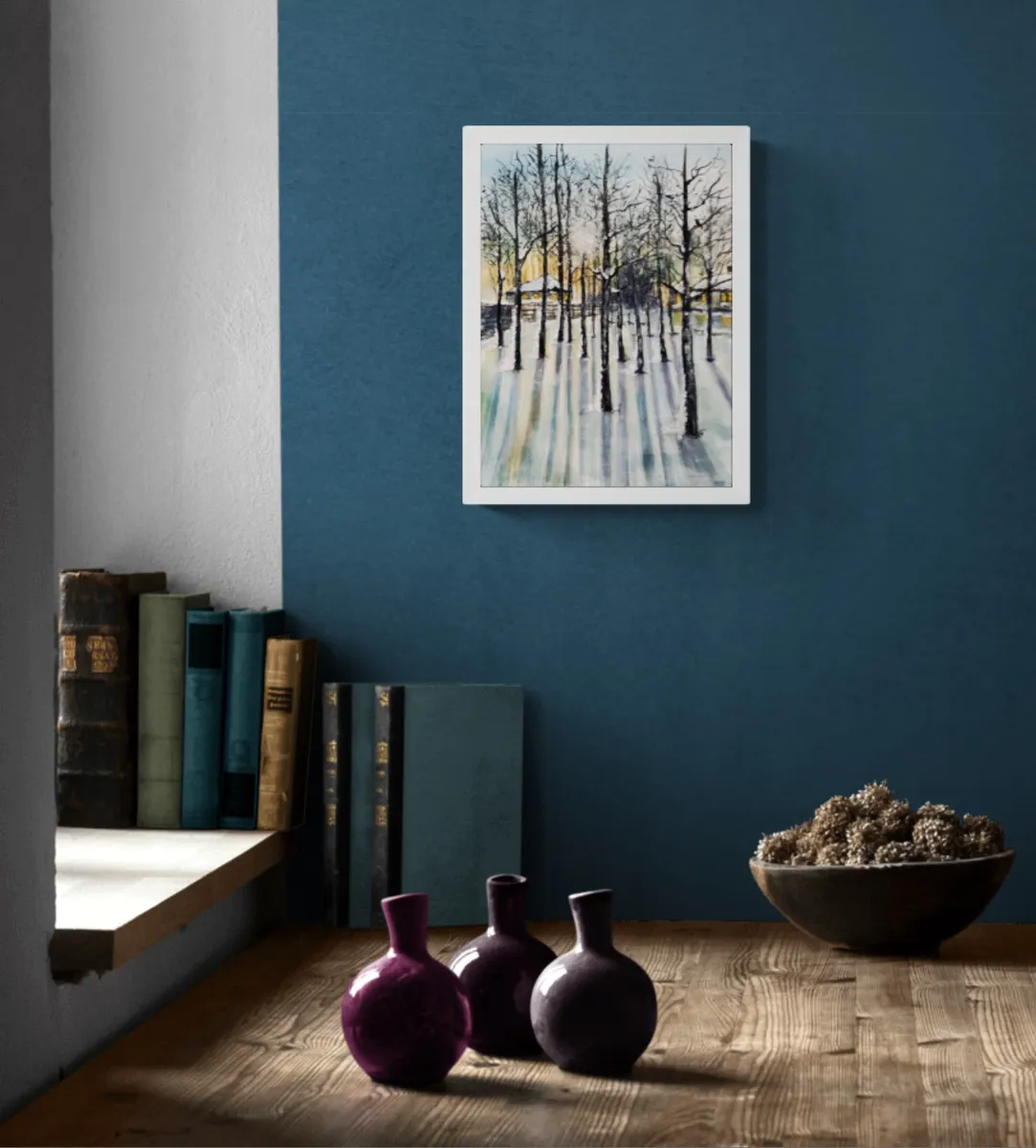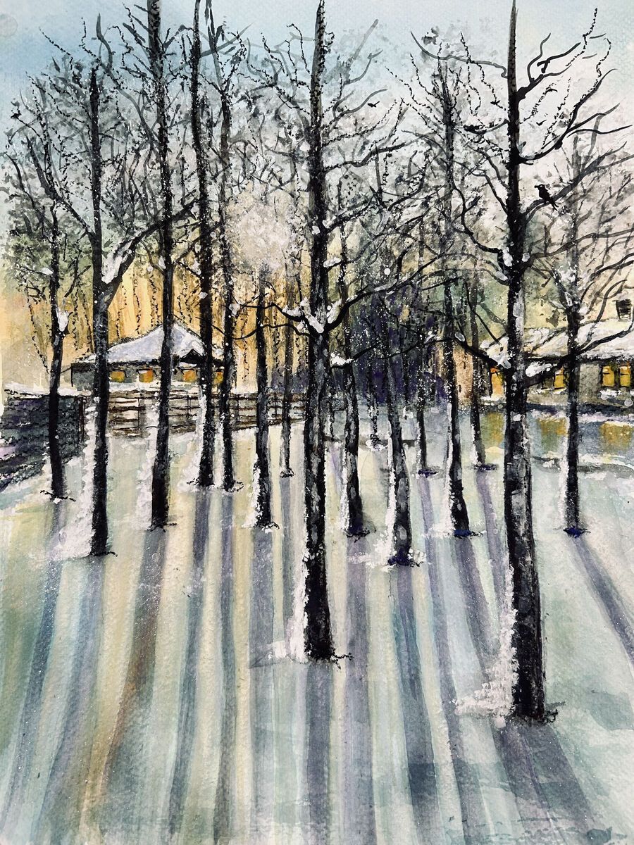 Glowing light and long trees shadows in a short winter day. White frame. Inspired by photo of my daughter-in-law Olga L.