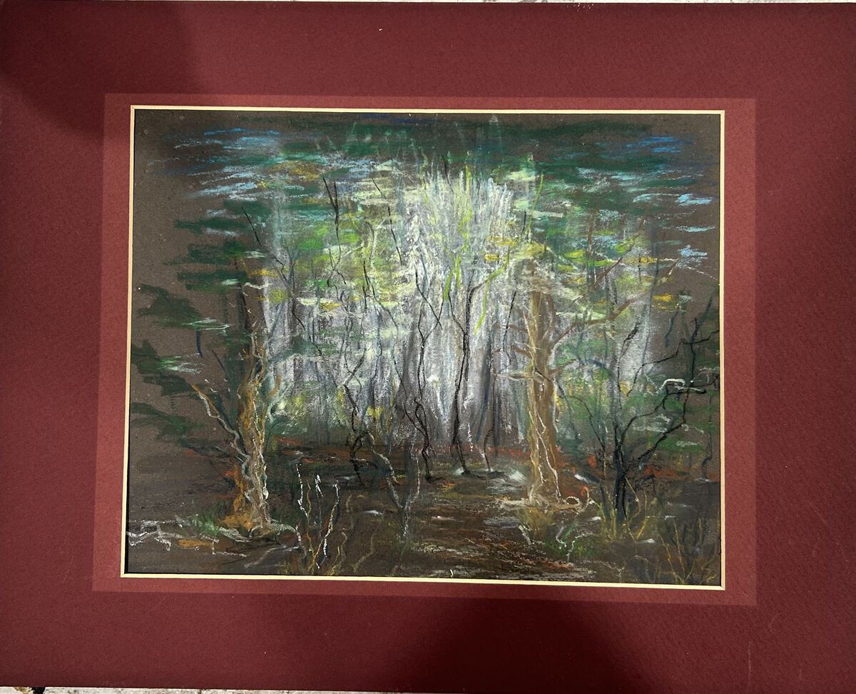 My first try of the oil pastels on a black paper. Framed. Inspired by the Forest of Harry Potter novels.